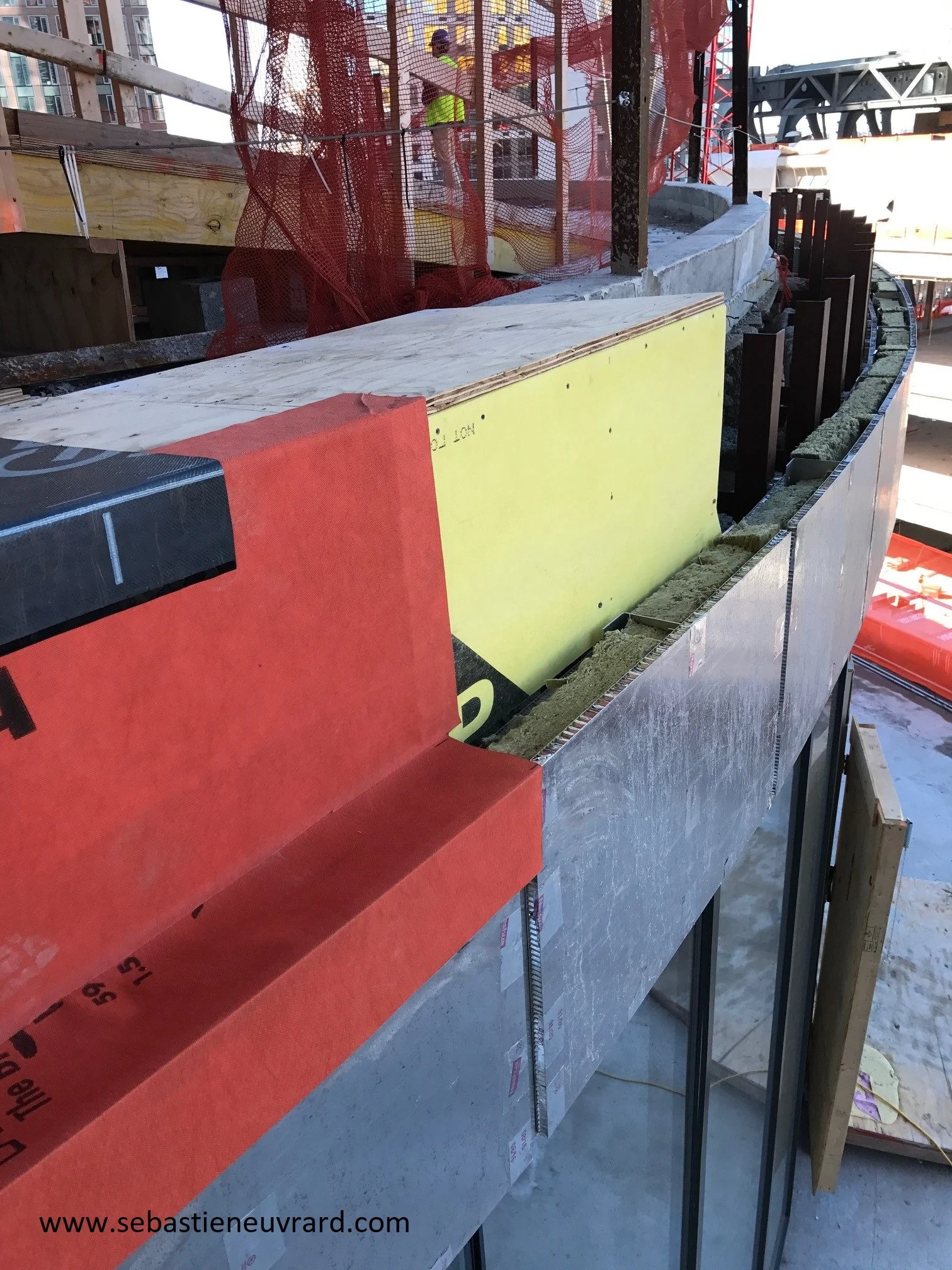 The parapet above the curved curtain wall must be insulated and then waterproofed.
