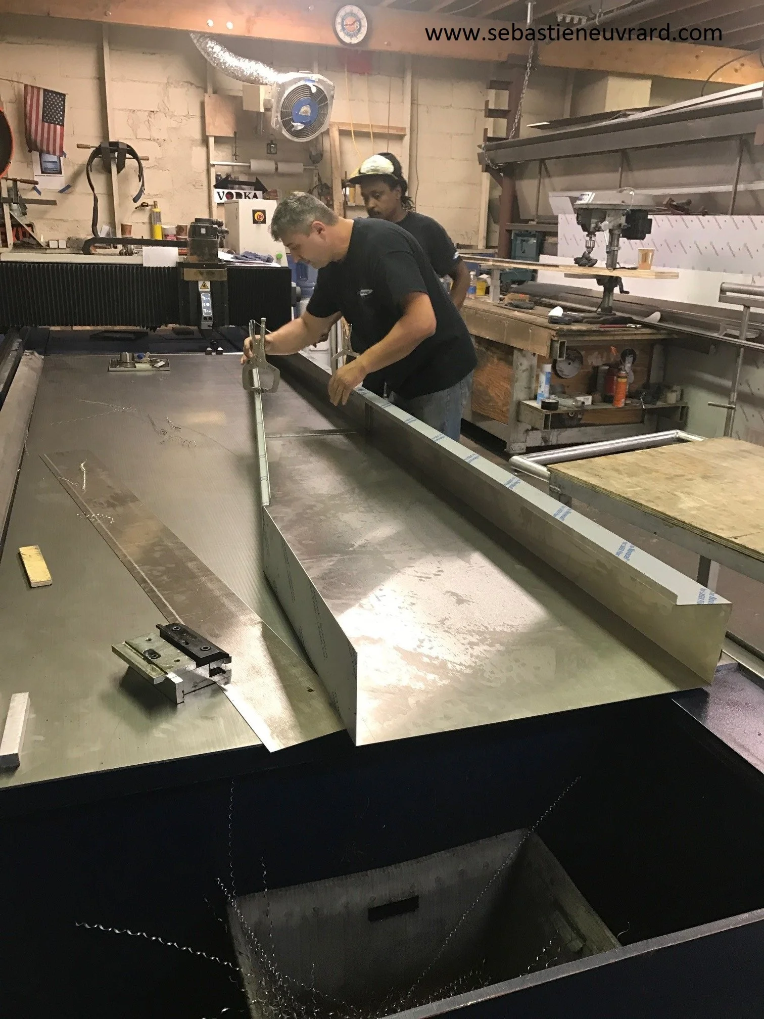 Then draw in 3D Cad the final stainless piece, determine the unfolded flat, cut it flat on the waterjet, V-groove the exposed bends, bend all the lips, weld the corners.