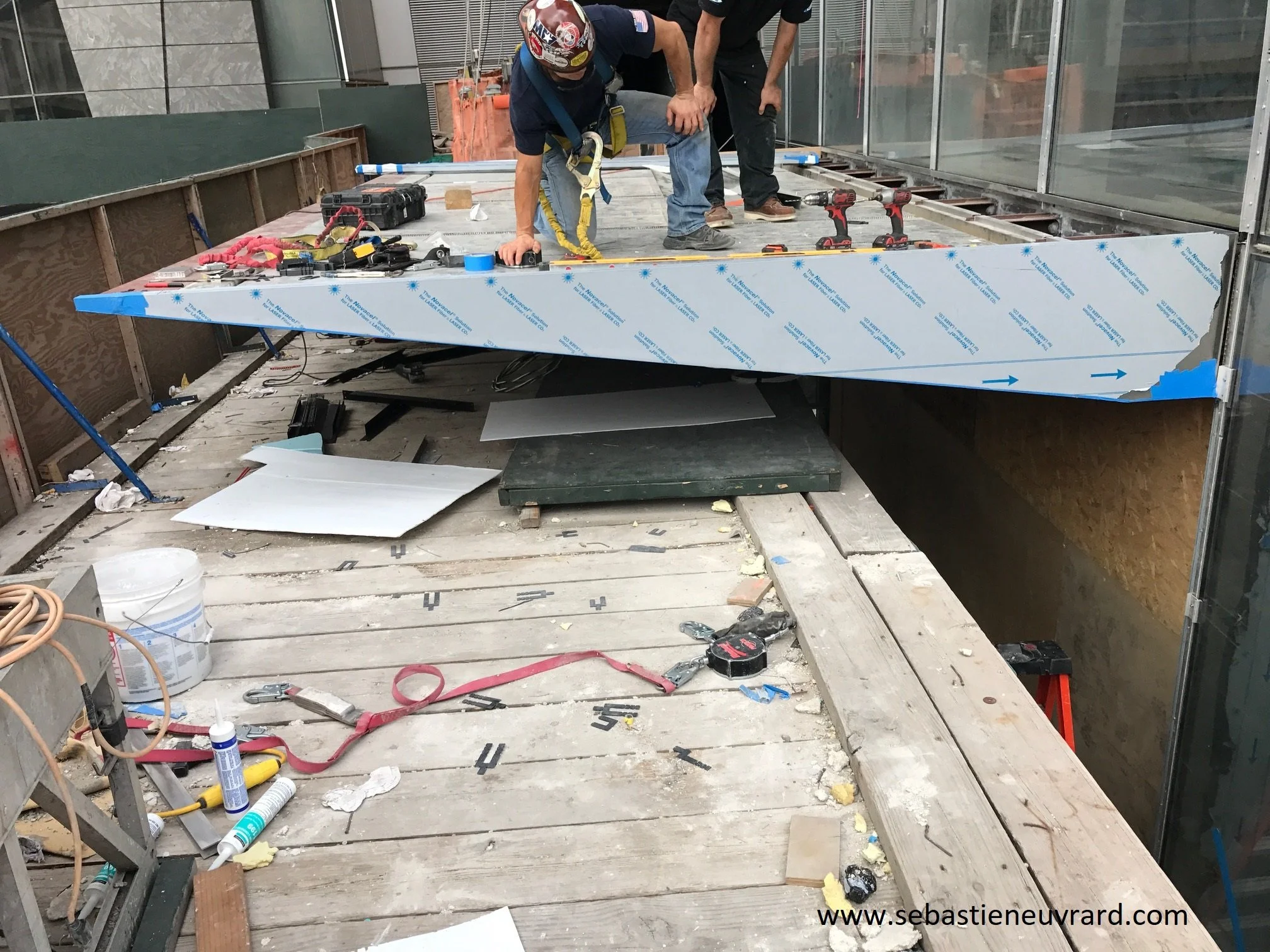 Then, using adhesive foil-tape, we simply cover the open joints in between panels and the heads of screws.
